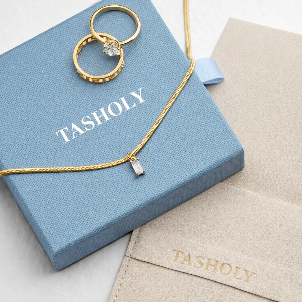 Each Tasholy piece arrives ready to gift in our signature individual jewelry box. Within is a reusable soft-touch pouch for safeguarding your cherished pieces.